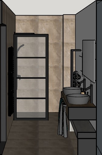 Voor een lief stel uit Lelystad heb ik de totale interieurstyling en vooraf het interieurontwerp van o.a. deze badkamer mogen doen, het ontwerp is uitgewerkt in 3D. Dit appartementencomplex is nieuw, dus er zijn alleen foto's van het prachtige eindresultaat. Het meubel van betonciré in combinatie met het oud eiken blad geven de badkamer een warme uitstraling. De afwerking met de natuurstenen waskommen, zwarte kranen en de industriële glazen douchewand maken het plaatje compleet.