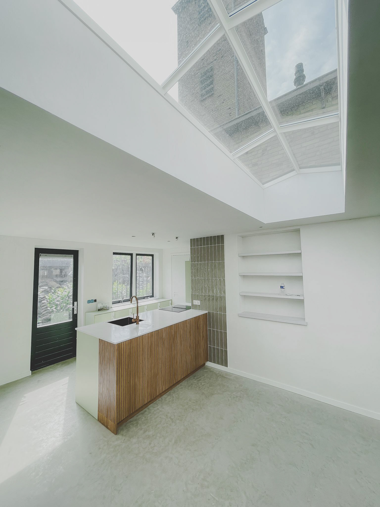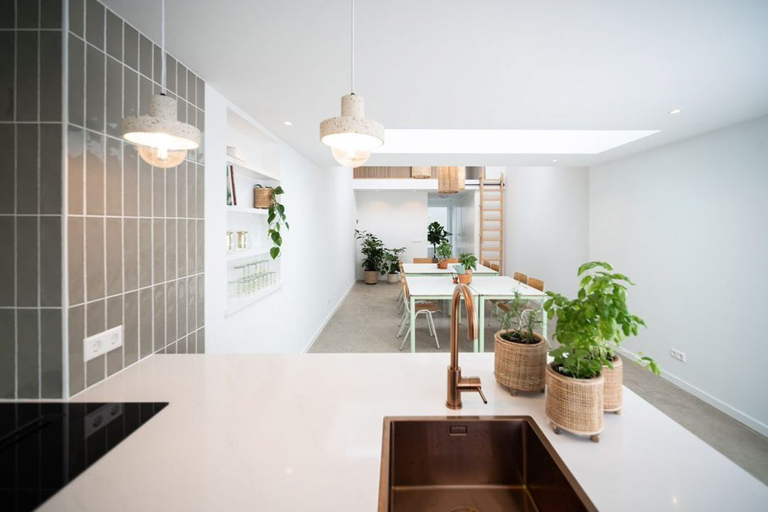 Van opslagruimte naar appartement en workshop-, vergaderruimte. De indeling van de ruimte werd volledig op maat ontworpen en in 3D gepresenteerd. De keuken komt prachtig tot zijn recht: het kookeiland met eiken latjes verbergt subtiel de push-to-open kastjes en vormt samen met de frisse groene kleur een warme, eigentijdse uitstraling. Ook de houten roomdivider en de keuken zijn op maat gemaakt. De divider is uitgevoerd in massief eiken en gerealiseerd in samenwerking met