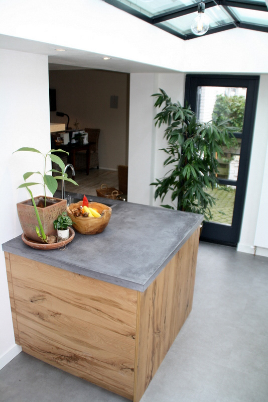Voor deze klant uit Langbroek maakte ik een nieuw keukenontwerp in 3D, met als doel: meer opbergruimte en een praktische indeling. Door de bijkeuken en een deel van de garage bij de keuken te betrekken ontstond er een zee van ruimte met volop werk- en afzetruimte. De wasmachine en droger zijn mooi weggewerkt achter de hoge kastenwand, waardoor de riante keuken veel rust uitstraalt. De woonkamer kreeg tegelijkertijd een totaal nieuwe uitstraling. Het gebruik van natuurlijke materialen, eiken fronten, een betonnen aanrechtbladen een betonlook pvc-vloer zorgen samen voor een warme, rustige sfeer. De lichtstraat brengt extra daglicht en versterkt het gevoel van ruimte,.Beoordeel zelf het eindresultaat van deze prachtige keukenrenovatie - een project waar functionaliteit en design perfect samenkomen.