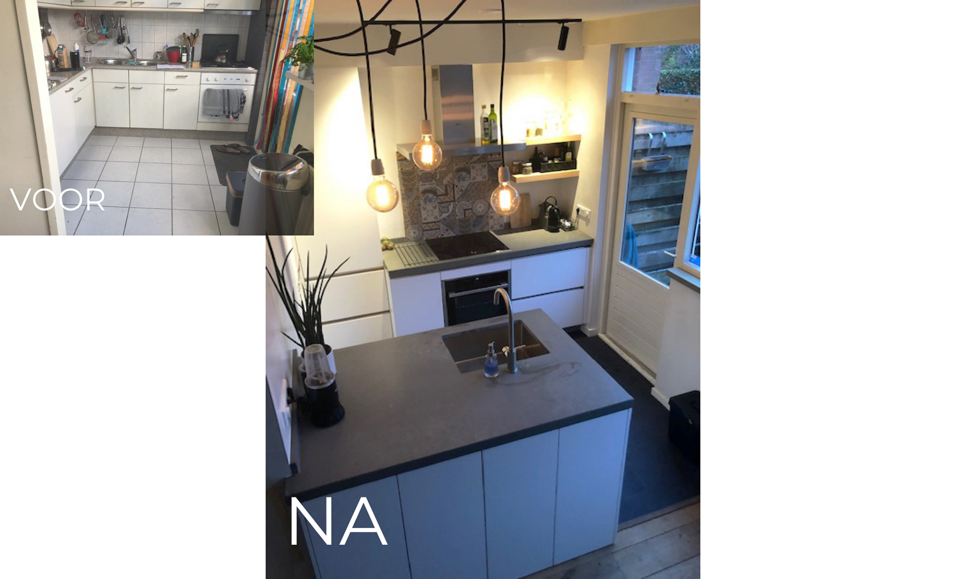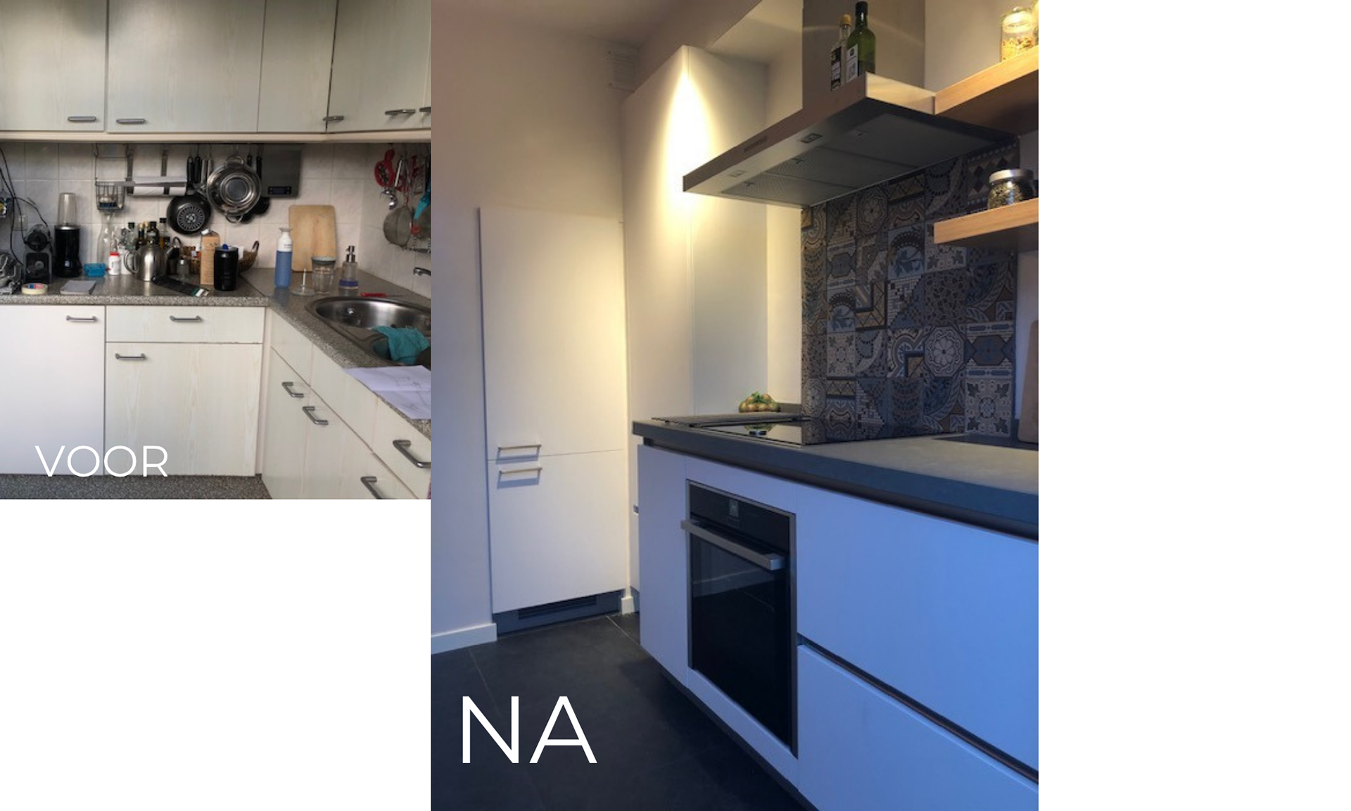 Letterlijk een "Ontwerp op maat".Advies in kleur, materiaal en verlichting. De kleine ruimte is volledig benut en ademt een rustige sfeer uit, is strak en overzichtelijk met veel kastruimte. De tegeltjes achter de kookplaat zijn echte oudjes, wat een heel eigen look geeft aan deze gezellige keuken. Kleine volle keuken omgetoverd tot een sfeervol geheel.....strak en overzichtelijk met veel kastruimte. De koelkast is in de wand verwerkt, onder de trap, wat veel ruimte creëert. De oud gebakken tegeltjes geven het geheel een warme uitstraling. Kijk zelf - hoe verrassend veel ruimte er is gecreëerd!