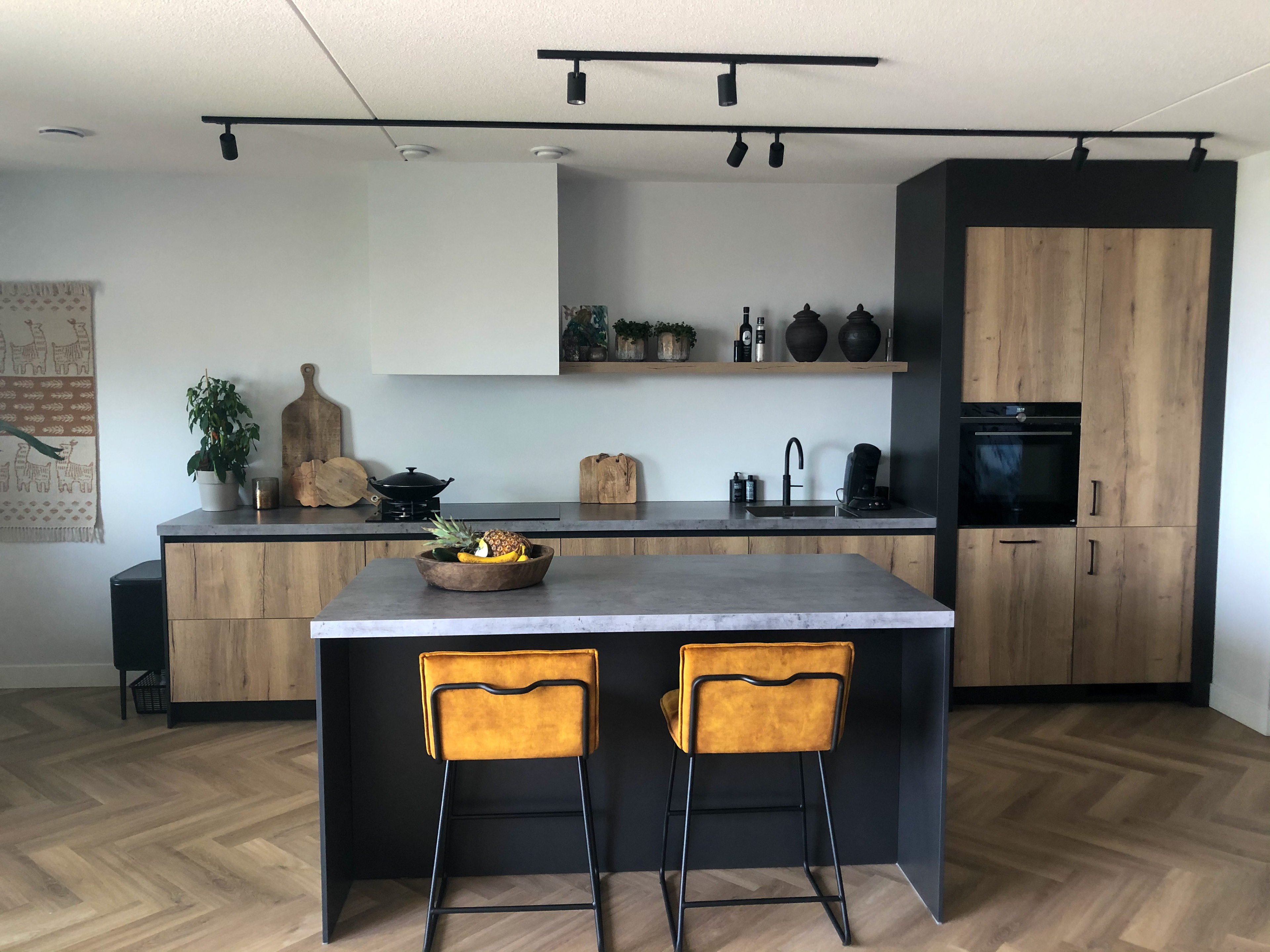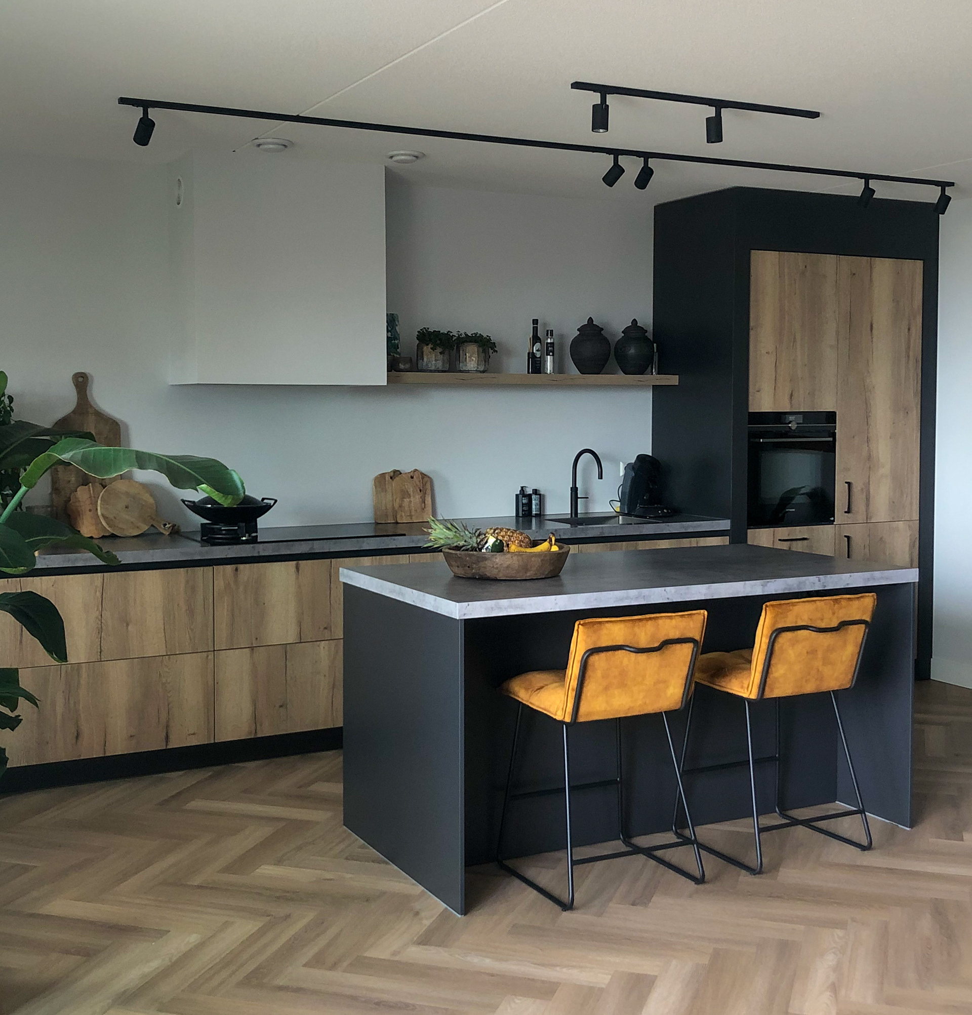 Het plaatje compleet gemaakt met een eiken visgraat vloer en goeie verlichting.