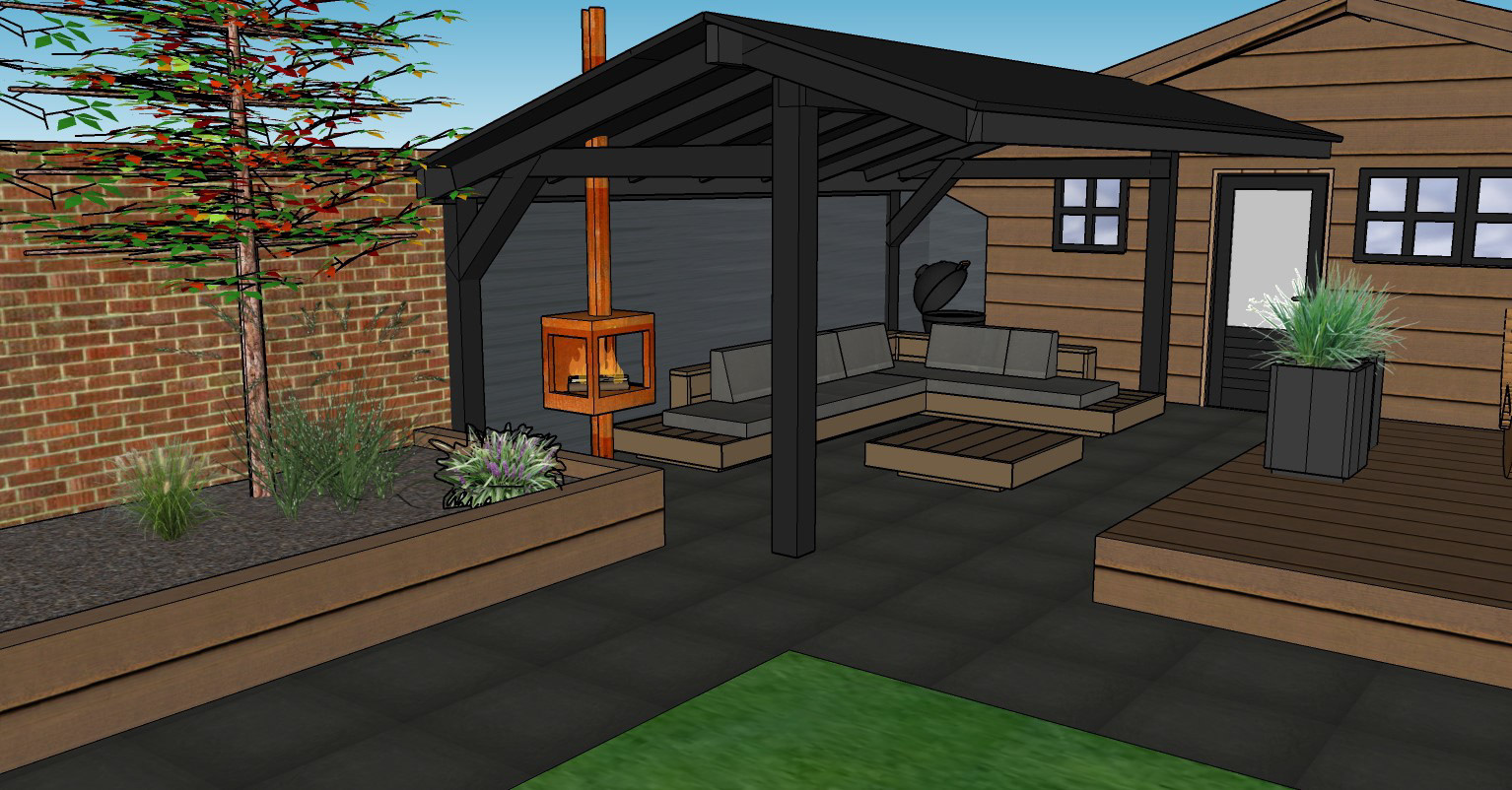 Voor deze ruime tuin heb ik het ontwerp in 3D van de veranda gemaakt, de bouw is uitgevoerd door Ben's Bouwbedrijf. Het is een heerlijke plek geworden, waar met de warmte van de houtkachel de avonden lang mogen duren... Interesse in deze kachel? Neem dan even contact met me op.