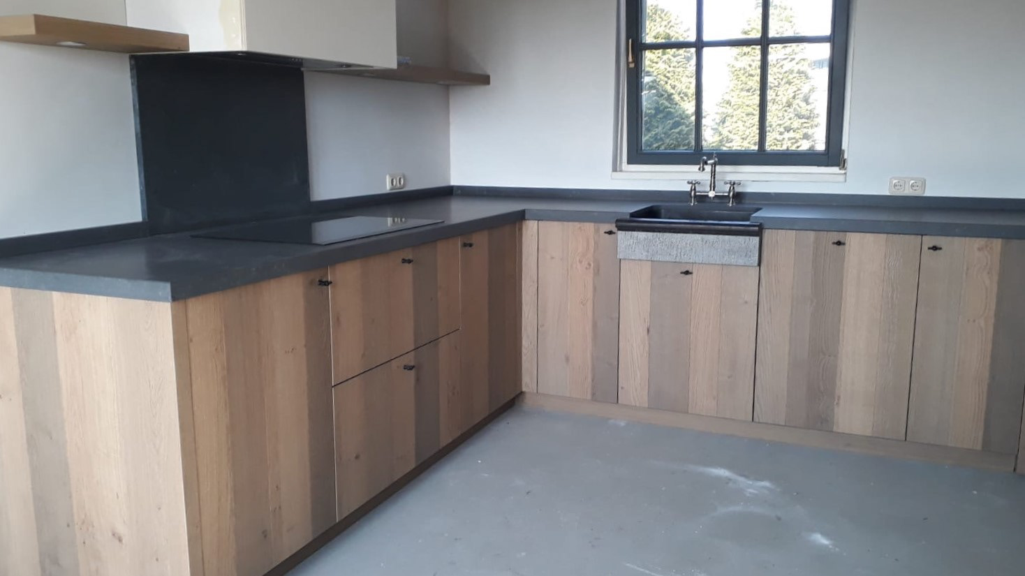 Eiken keukenfronten, composiet aanrechtblad, hardstenen spoelbak met Amsterdams profiel en een gefrijnde voorzijde. De schuifdeuren naar hal, klompenhok en woonkamer...