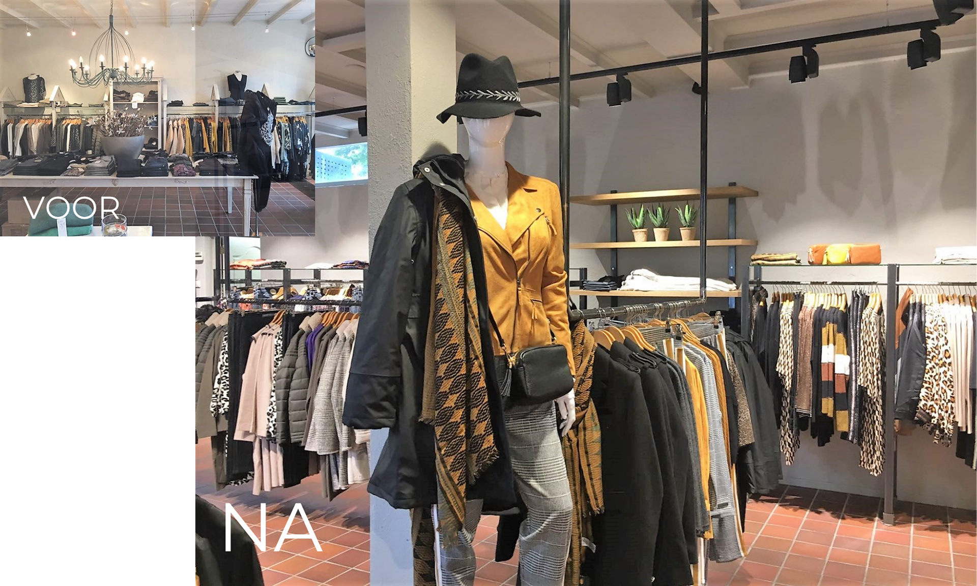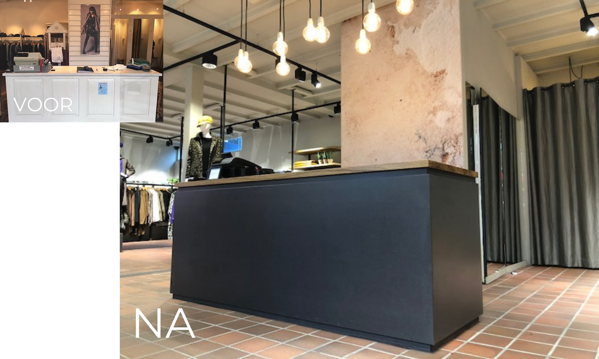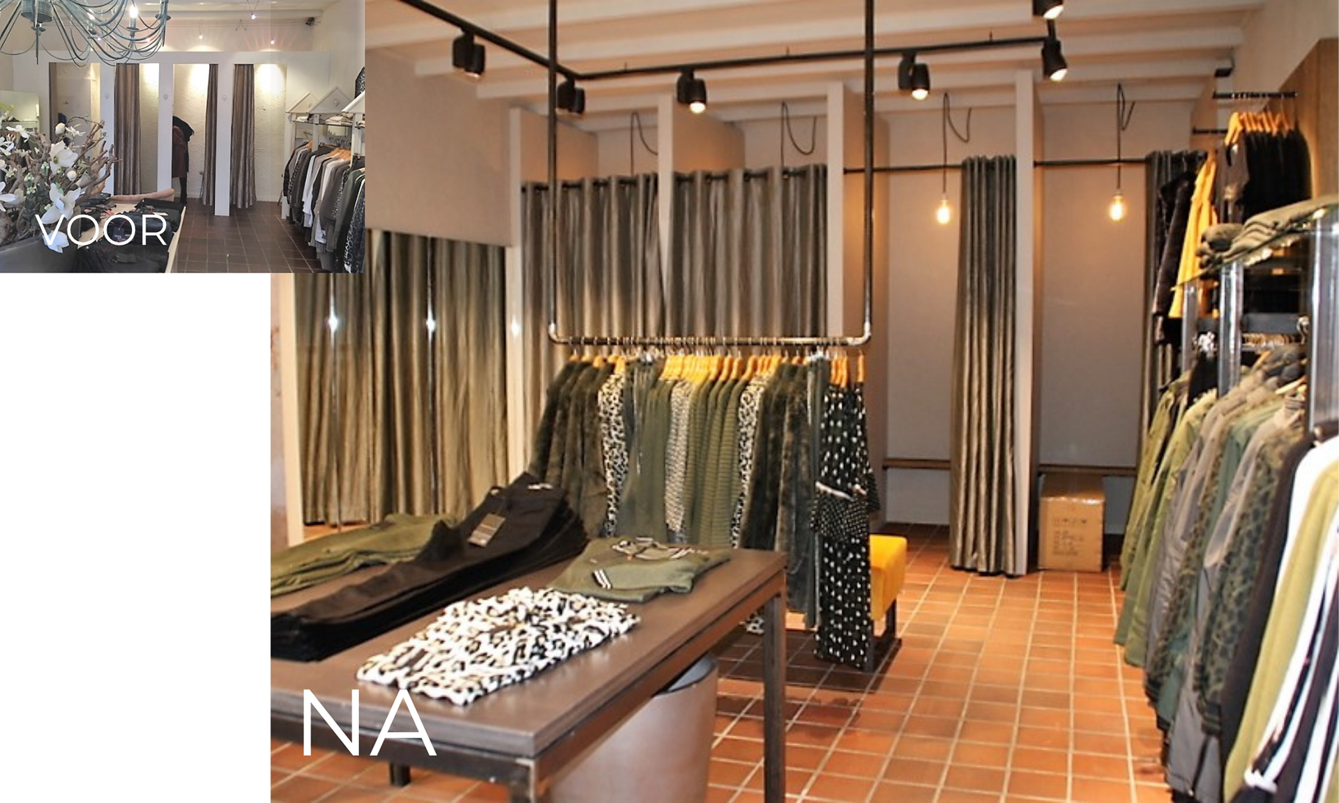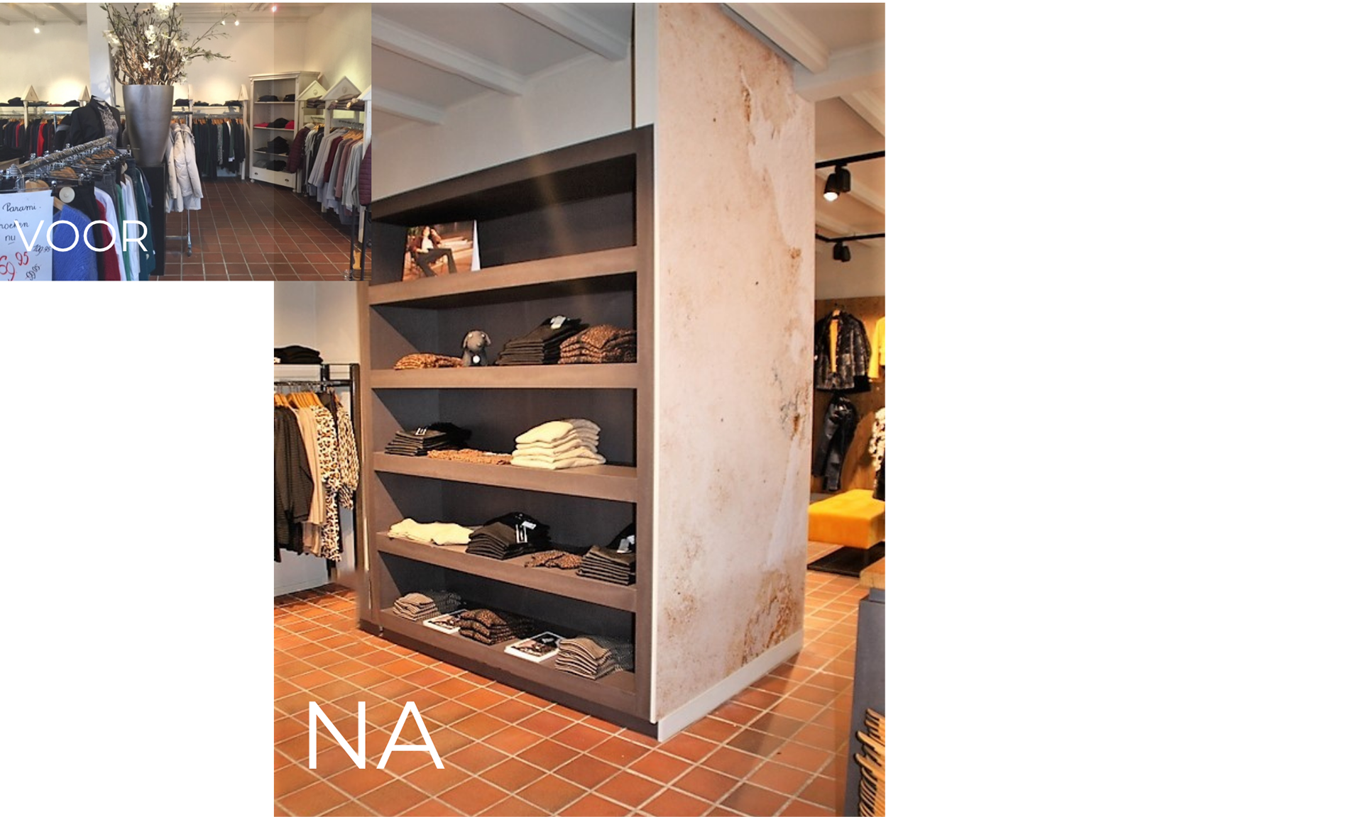 Restyling van Damesmode La Mar in Driebergen. Stoere materialen gebruikt.... betonlook, staal, eiken, fotobehang van een oude muur en een fris oker kleuraccent. In samenwerking met Ben's Bouwbedrijf is dit mooie project gerealiseerd.